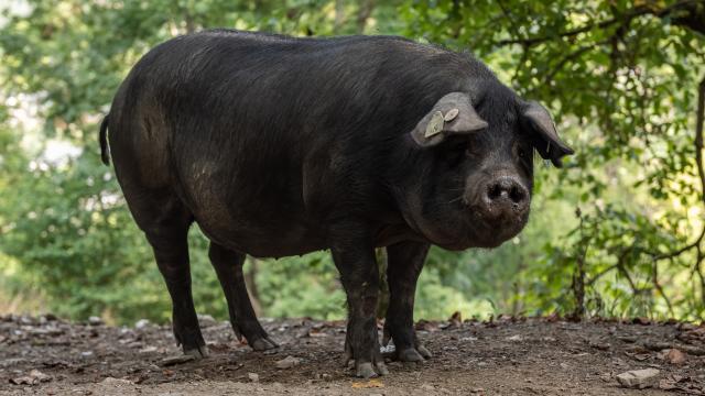 Es al pie de las montañas donde el cerdo Noir de Bigorre viaja en pequeñas piaras para alimentarse, aprovechando una alimentación sana basada en los recursos naturales de su entorno: hierba, bellotas, castañas. Sin OGM.